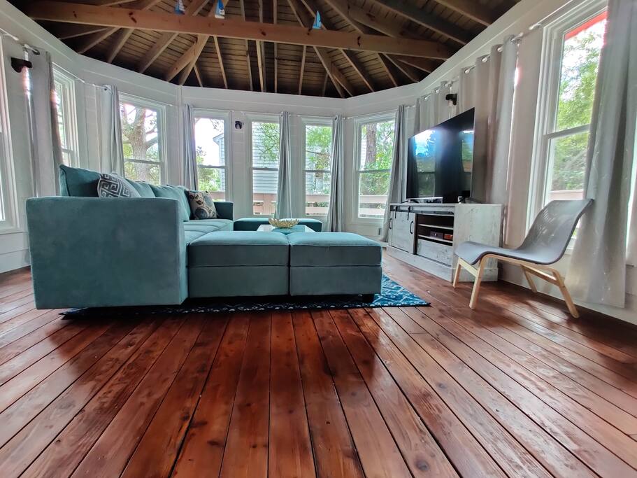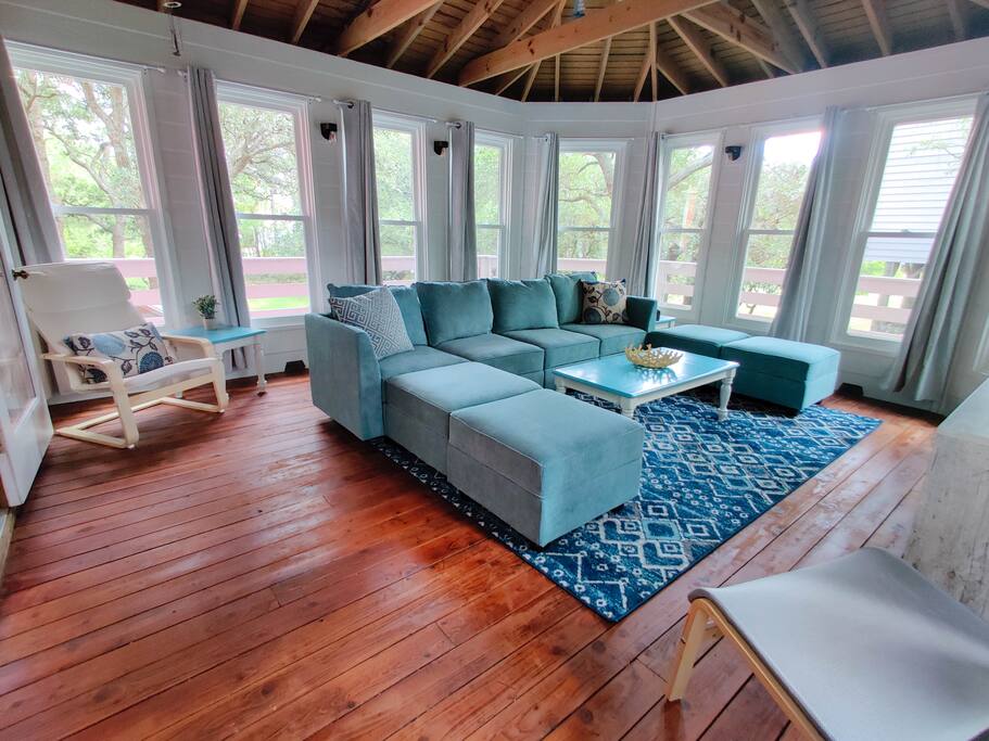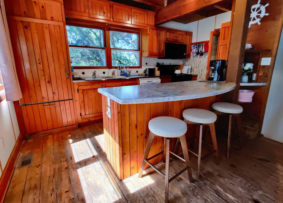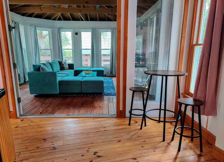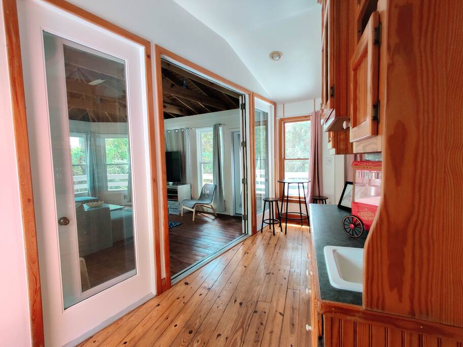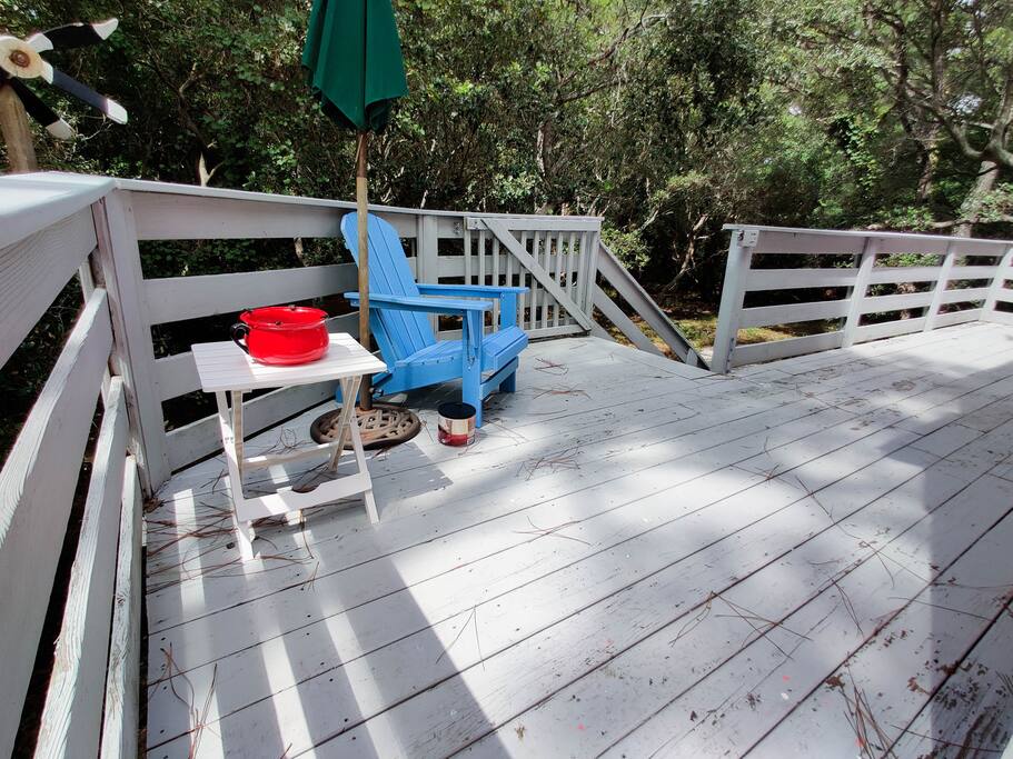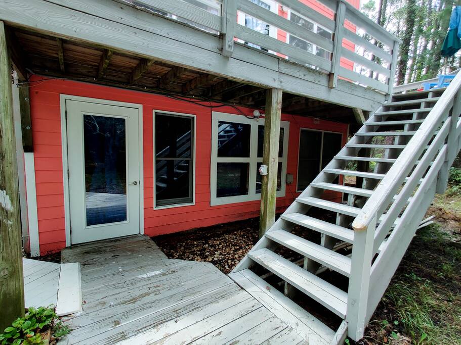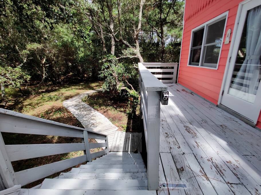 ** Please note that the ground floor has been renovated and is awaiting updated photographs - bathroom, couch, bunk beds, and full bed are in the same layout, but there is no carpet and finishes have been upgraded. Please ask if any questions** The Coral Treehouse is perfect for a large family or two smaller families travelling together. Three bedrooms and two sofas sleep up to 10 people. It is the perfect place to enjoy with friends and family, adult, child, pet-friendly. The ground floor comprises a full bathroom, a bedroom with full bed, a bedroom with bunk beds, and a living area with a smart TV and convertible sleeper sofa. The second floor is the main living area. It has a kitchen with breakfast counter and is stocked with cooking essentials; ten seat dining table; wet bar with wine fridge and glasses; full bathroom; a gorgeous sunroom with smart TV and sectional sofa which can be rearranged into a bed; and a deck which wraps around two thirds of the house. On the third floor is the master bedroom with queen bed and trundle bed, a full bath, office area, and a large closet containing a highchair and pack n' play. Additionally, a storage area on the ground level holds yard games as well as beach gear (chairs, blankets, umbrellas) and a wagon to transport it all.