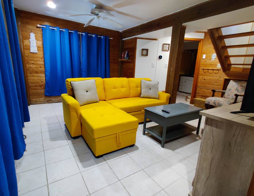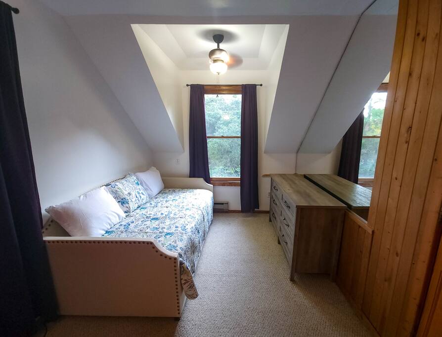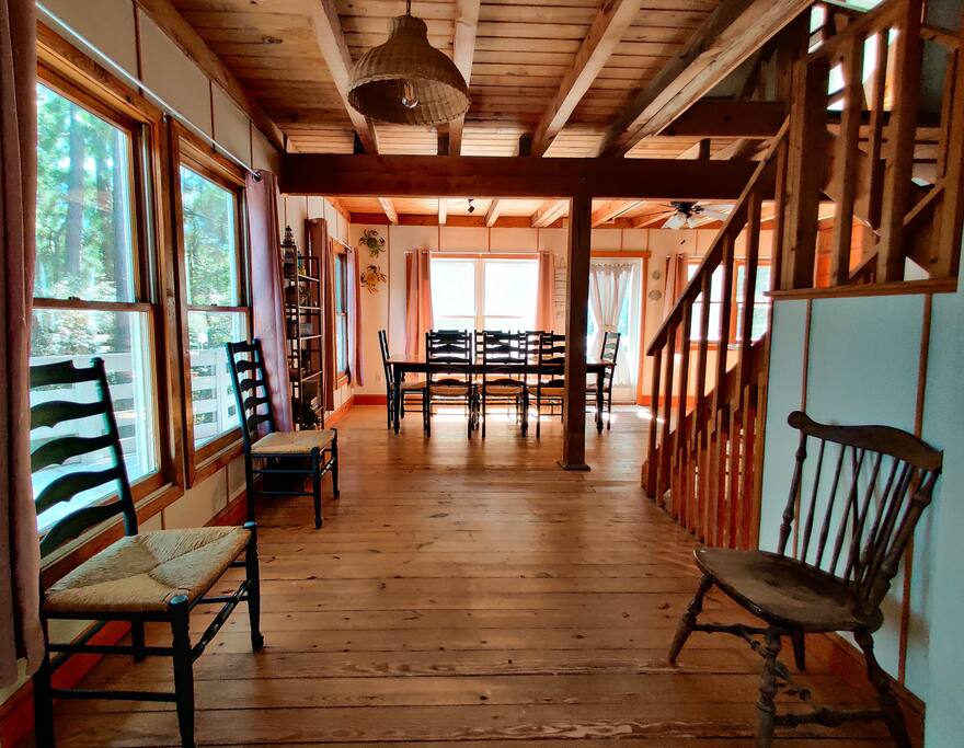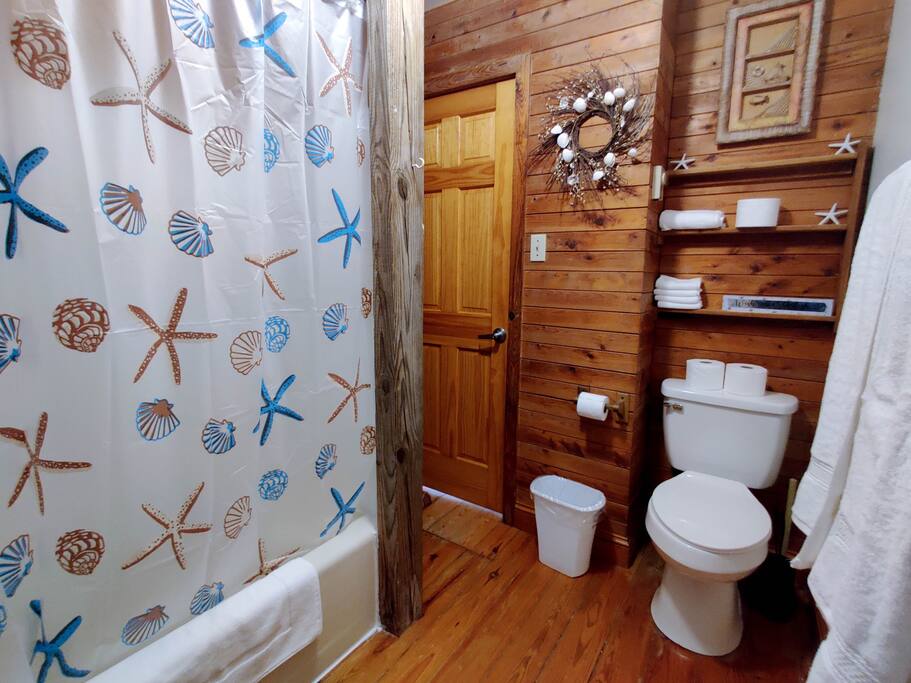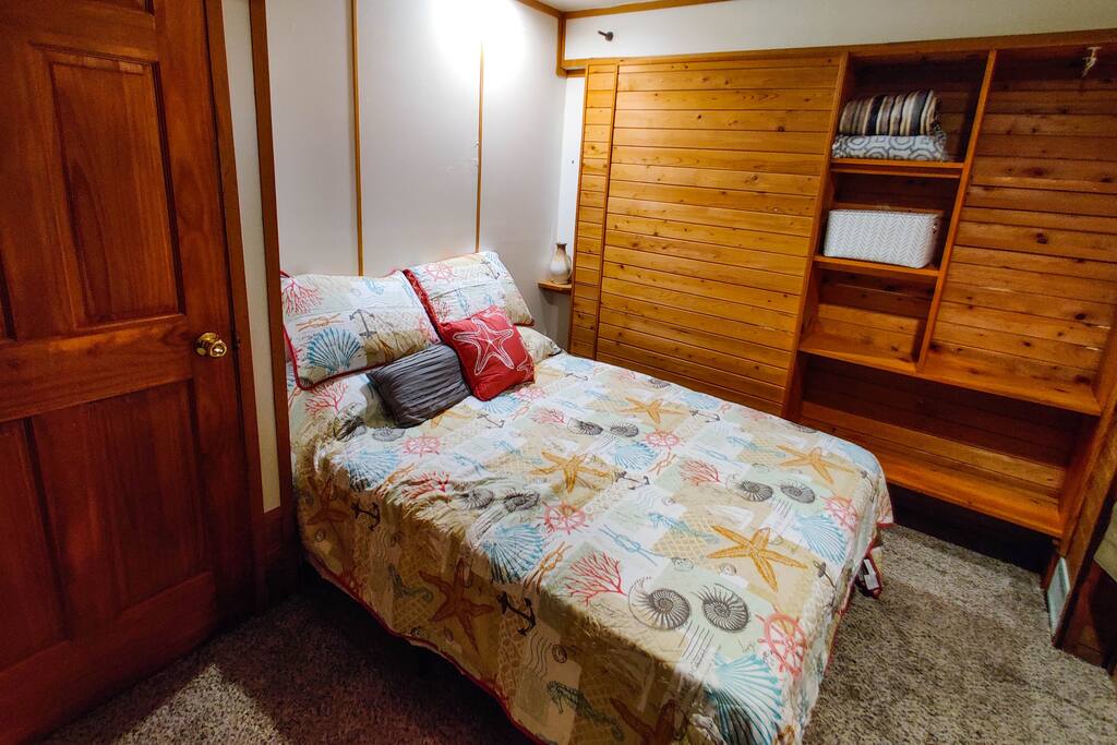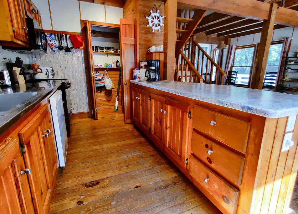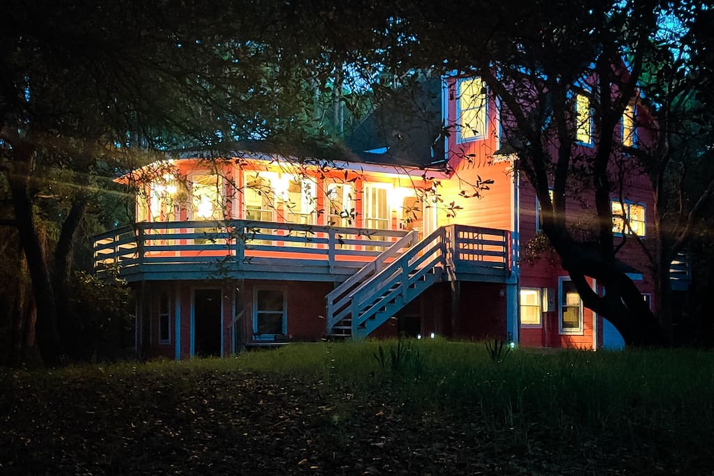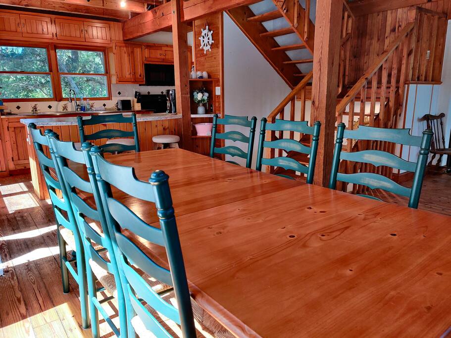 ** Please note that the ground floor has been renovated and is awaiting updated photographs - bathroom, couch, bunk beds, and full bed are in the same layout, but there is no carpet and finishes have been upgraded. Please ask if any questions** The Coral Treehouse is perfect for a large family or two smaller families travelling together. Three bedrooms and two sofas sleep up to 10 people. It is the perfect place to enjoy with friends and family, adult, child, pet-friendly. The ground floor comprises a full bathroom, a bedroom with full bed, a bedroom with bunk beds, and a living area with a smart TV and convertible sleeper sofa. The second floor is the main living area. It has a kitchen with breakfast counter and is stocked with cooking essentials; ten seat dining table; wet bar with wine fridge and glasses; full bathroom; a gorgeous sunroom with smart TV and sectional sofa which can be rearranged into a bed; and a deck which wraps around two thirds of the house. On the third floor is the master bedroom with queen bed and trundle bed, a full bath, office area, and a large closet containing a highchair and pack n' play. Additionally, a storage area on the ground level holds yard games as well as beach gear (chairs, blankets, umbrellas) and a wagon to transport it all.